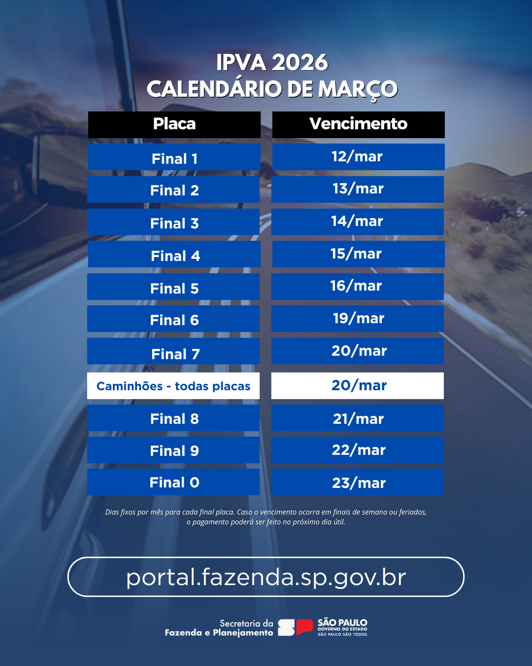 Você está em: Início > Notícias > Calendário de março da Sefaz-SP é focado na terceira parcela do IPVA 2026 dos veículos Hidden Calendário de março da Sefaz-SP é focado na terceira parcela do IPVA 2026 dos veículos Imagem 09/03/2026 11:00 Retificado em: Imagem de Página Conteúdo da PáginaEm março, a Secretaria da Fazenda e Planejamento do Estado de São Paulo (Sefaz-SP) concentra o calendário de vencimentos do IPVA 2026 para os proprietários de veículos quitarem a terceira parcela do imposto. Já os proprietários de caminhões de todas as placas têm até 20 de março para optar pelo parcelamento pagando a primeira parcela do IPVA 2026. Os contribuintes devem ficar atentos às datas de vencimento para que não haja quebra do parcelamento, além da incidência de juros e multa. O prazo para os veículos de placa com final 1 vence na quinta-feira, 12/3. Já na sexta, 13/3, é a vez dos que possuem placas de final 2. O calendário do IPVA 2026 segue até 23/3, quando vence o prazo para os veículos com final 0 (confira a tabela abaixo). Caso o vencimento ocorra em finais de semana ou feriados, o pagamento poderá ser feito no próximo dia útil. A consulta do valor pode ser realizada em toda a rede bancária, a partir do número de Renavam (Registro Nacional de Veículo Automotor) ou diretamente no portal da Sefaz-SP, clicando aqui. A Sefaz-SP reforça que as páginas oficiais para informações do IPVA 2026 estão no domínio “sp.gov.br”. Para mais informações, os proprietários dos veículos podem acessar a página do IPVA ou entrar em contato pelos canais do Fale Conosco. Formas de pagamento O Pix segue sendo a maneira preferencial e mais fácil de realizar o pagamento do tributo. Ao obter o QR code, gerado exclusivamente no site da Sefaz-SP, o recolhimento pode ser feito junto a mais de 900 instituições financeiras, contemplando especialmente os cidadãos com contas digitais e que não possuem conta nos grandes bancos. Para utilizar a modalidade, é necessário acessar a página do IPVA no portal da Sefaz-SP, informar os dados do veículo e gerar um QR code, que servirá para o pagamento. O QR code Pix tem validade de 15 minutos, após o qual expira. Não tendo sido pago, será necessário emitir um novo QR code (sempre pelo site da Sefaz-SP). Na tela do QR code, há um contador temporal de “tempo restante" indicando quando o código expirará. Ao ler o QR code com o aplicativo de banco ou instituição de pagamento, aparecerá a informação de que o pagamento é destinado à “Secretaria da Fazenda e Planejamento", sob o CNPJ 46.377.222/0003-90 em conta do Banco do Brasil. Continuam valendo as demais opções de recolhimento diretamente na rede bancária. Para efetuar o pagamento do IPVA 2026, basta o contribuinte utilizar o número do Renavam (Registro Nacional de Veículo Automotor). É possível efetuar o pagamento pela internet, nos terminais de autoatendimento ou outros canais oferecidos pela instituição bancária. Também é possível realizar o pagamento em casas lotéricas e com cartão de crédito, nas empresas credenciadas à Secretaria da Fazenda e Planejamento. As operadoras financeiras conveniadas têm autonomia para definir o número de parcelas e adequar a melhor negociação com o contribuinte. Os valores pagos ao correspondente bancário são repassados ao Governo do Estado de forma imediata, e sem qualquer desconto ou encargo. Licenciamento Os proprietários que desejam antecipar o licenciamento anual deverão quitar todos os débitos que recaiam sobre o veículo, incluindo o IPVA, a taxa de licenciamento e, se for o caso, multas de trânsito. Todas as informações sobre IPVA podem ser consultadas na página do IPVA no portal da Sefaz-SP. Atraso de pagamento O contribuinte que deixar de recolher o imposto fica sujeito a multa de 0,33% por dia de atraso e juros de mora com base na taxa Selic. Passados 60 dias, o percentual da multa fixa-se em 20% do valor do imposto. Permanecendo a inadimplência do IPVA, o débito será inscrito na Dívida Ativa, além da inclusão do nome do proprietário no Cadin Estadual, impedindo-o de aproveitar eventual crédito que possua por solicitar a Nota Fiscal Paulista. A partir do momento em que o débito de IPVA estiver inscrito, a Procuradoria Geral do Estado poderá vir a cobrá-lo mediante protesto. A inadimplência do IPVA impede o novo licenciamento do veículo. Após a data limite fixada pelo Detran para o licenciamento, o veículo pode ser apreendido, com multa aplicada pela autoridade de trânsito e sete pontos na Carteira Nacional de Habilitação (CNH). Todas as informações sobre IPVA podem ser consultadas na página do IPVA no portal da Sefaz-SP. Confira abaixo o calendário de vencimento do IPVA-2026 Automóveis, Camionetas, Caminhonetes, Ônibus, Micro-ônibus, Motos e similaresMês marçoabrilmaioParcela 3ª Parcela4ª Parcela5ª ParcelaPlaca VencimentoVencimentoVencimentoFinal 1 12/mar12/abr12/maiFinal 2 13/mar13/abr13/maiFinal 3 14/mar14/abr14/maiFinal 4 15/mar15/abr15/maiFinal 5 16/mar16/abr16/maiFinal 6 19/mar19j/abr19j/maiFinal 7 20/mar20/abr20/maiFinal 8 21/mar21/abr21/maiFinal 9 22/mar22/abr22/maiFinal 0 23/mar23/abr23/maiCaminhões e Caminhões-tratoresMêsmarçoabrilmaiojulhoagostosetembroParcela1ª ParcelaCota Única SEM Desconto2ª Parcela3ª Parcela4ª Parcela5ª ParcelaPlacaVencimentoVencimentoVencimentoVencimentoVencimentoVencimentoFinal 120/mar22/abr20/mai20/jul20/ago20/setFinal 2Final 3Final 4Final 5Final 6Final 7Final 8Final 9Final 0 Tags Relacionadas: CALENDÁRIO IPVA; Vencimento; IPVA 2026 Noticias Relacionadas20/03/2026Veículos com placas finais 8, 9 e 0 têm prazo até segunda, 23/3, para pagamento da 3ª parcela do IPVA (...) 19/03/2026Vence nesta sexta-feira, 20/3, parcela do IPVA 2026 para veículos com placa final 7 e caminhões 18/03/2026IPVA 2026: 3ª parcela para veículos com placa final 6 vence nesta quinta-feira, 19/313/03/2026IPVA 2026: 3ª parcela para 