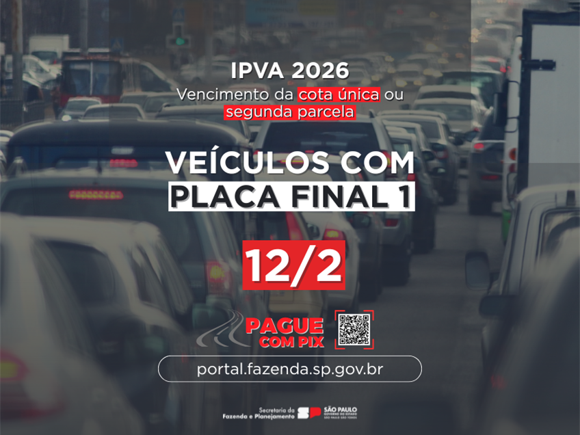 Você está em: Início > Notícias > Veículos placa final 1: IPVA 2026 vence nesta quinta-feira, 12/2 Hidden Veículos placa final 1: IPVA 2026 vence nesta quinta-feira, 12/2 Imagem 11/02/2026 14:00 Retificado em: Imagem de Página Conteúdo da PáginaO segundo ciclo de vencimentos do Imposto sobre a Propriedade de Veículos Automotores (IPVA) de 2026 tem início nesta quinta-feira (12) para os veículos paulistas com final de placa 1. Em fevereiro, os proprietários de veículos devem recolher o IPVA 2026 de forma integral, sem desconto, ou, para quem parcelou o tributo, realizar o pagamento da segunda cota, A Secretaria da Fazenda e Planejamento do Estado de São Paulo (Sefaz-SP) alerta que o calendário de vencimentos do IPVA 2026 é de acordo com o final de placa dos veículos e após o vencimento começa a incidir juros e multa e a quebra do parcelamento..O prazo para os veículos de placa com final 1 vence na quinta, 12/2. Já na sexta, 13/2, é a vez dos que possuem placas de final 2. O calendário do IPVA 2026 segue até 23/2, quando vence o prazo para os veículos com final 0 (confira a tabela abaixo). Caso o vencimento ocorra em finais de semana ou feriados, o pagamento poderá ser feito no próximo dia útil. A consulta do valor pode ser realizada em toda a rede bancária, a partir do número de Renavam (Registro Nacional de Veículo Automotor) ou diretamente no portal da Sefaz-SP, clicando aqui. A Sefaz-SP reforça que as páginas oficiais para informações do IPVA 2026 estão no domínio “sp.gov.br”. Para mais informações, os proprietários dos veículos podem acessar o Portal de Serviços de Veículos, ou entrar em contato pelos canais do Fale Conosco. Formas de pagamento O Pix segue sendo a maneira preferencial e mais fácil de realizar o pagamento do tributo. Ao obter o QR code, gerado exclusivamente no site da Sefaz-SP, o recolhimento pode ser feito junto a mais de 900 instituições financeiras, contemplando especialmente os cidadãos com contas digitais e que não possuem conta nos grandes bancos. Para utilizar a modalidade, é necessário acessar a página do IPVA no portal da Sefaz-SP, informar os dados do veículo e gerar um QR code, que servirá para o pagamento. O QR code Pix tem validade de 15 minutos, após o qual expira. Não tendo sido pago, será necessário emitir um novo QR code (sempre pelo site da Sefaz-SP). Na tela do QR code, há um contador temporal de “tempo restante" indicando quando o código expirará. Ao ler o QR code com o aplicativo de banco ou instituição de pagamento, aparecerá a informação de que o pagamento é destinado à “Secretaria da Fazenda e Planejamento", sob o CNPJ 46.377.222/0003-90 em conta do Banco do Brasil. Continuam valendo as demais opções de recolhimento diretamente na rede bancária. Para efetuar o pagamento do IPVA 2026, basta o contribuinte utilizar o número do Renavam (Registro Nacional de Veículo Automotor). É possível efetuar o pagamento pela internet, nos terminais de autoatendimento ou outros canais oferecidos pela instituição bancária. Também é possível realizar o pagamento em casas lotéricas e com cartão de crédito, nas empresas credenciadas à Secretaria da Fazenda e Planejamento. As operadoras financeiras conveniadas têm autonomia para definir o número de parcelas e adequar a melhor negociação com o contribuinte. Os valores pagos ao correspondente bancário são repassados ao Governo do Estado de forma imediata, e sem qualquer desconto ou encargo. Licenciamento Os proprietários que desejam antecipar o licenciamento anual deverão quitar todos os débitos que recaiam sobre o veículo, incluindo o IPVA, a taxa de licenciamento e, se for o caso, multas de trânsito. Todas as informações sobre IPVA podem ser consultadas na página do IPVA no portal da Sefaz-SP. Atraso de pagamento O contribuinte que deixar de recolher o imposto fica sujeito a multa de 0,33% por dia de atraso e juros de mora com base na taxa Selic. Passados 60 dias, o percentual da multa fixa-se em 20% do valor do imposto. Permanecendo a inadimplência do IPVA, o débito será inscrito na Dívida Ativa, além da inclusão do nome do proprietário no Cadin Estadual, impedindo-o de aproveitar eventual crédito que possua por solicitar a Nota Fiscal Paulista. A partir do momento em que o débito de IPVA estiver inscrito, a Procuradoria Geral do Estado poderá vir a cobrá-lo mediante protesto. A inadimplência do IPVA impede o novo licenciamento do veículo. Após a data limite fixada pelo Detran para o licenciamento, o veículo pode ser apreendido, com multa aplicada pela autoridade de trânsito e sete pontos na Carteira Nacional de Habilitação (CNH). Todas as informações sobre IPVA podem ser consultadas na página do IPVA no portal da Sefaz-SP. Confira abaixo o calendário de vencimento do IPVA-2026 Automóveis, Camionetas, Caminhonetes, Ônibus, Micro-ônibus, Motos e similaresMêsfevereiromarçoabrilmaioParcela2ª Parcela ouCota Única SEM Desconto3ª Parcela4ª Parcela5ª ParcelaPlacaVencimentoVencimentoVencimentoVencimentoFinal 112/fev12/mar12/abr12/maiFinal 213/fev13/mar13/abr13/maiFinal 314/fev14/mar14/abr14/maiFinal 415/fev15/mar15/abr15/maiFinal 516/fev16/mar16/abr16/maiFinal 619j/fev19/mar19j/abr19j/maiFinal 720/fev20/mar20/abr20/maiFinal 821/fev21/mar21/abr21/maiFinal 922/fev22/mar22/abr22/maiFinal 023/fev23/mar23/abr23/mai Caminhões e Caminhões-tratoresMêsmarçoabrilmaiojulhoagostosetembroParcela1ª ParcelaCota Única SEM Desconto2ª Parcela3ª Parcela4ª Parcela5ª ParcelaPlacaVencimentoVencimentoVencimentoVencimentoVencimentoVencimentoFinal 120/mar22/abr20/mai20/jul20/ago20/setFinal 2Final 3Final 4Final 5Final 6Final 7Final 8Final 9Final 0 Tags Relacionadas: fevereiro; Vencimento; placa 1; IPVA 2026 Noticias Relacionadas12/02/2026Veículos placa final 2: IPVA 2026 vence nesta sexta-feira, 13/222/01/2026Pagamento à vista do IPVA 2026 para veículos com placa final 0 tem desconto de 3% até sext
