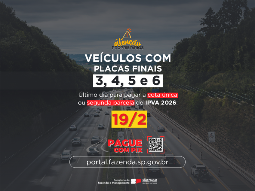 Você está em: Início > Notícias > Veículos placas finais 3, 4, 5 e 6: IPVA 2026 pode ser pago até quinta-feira, 19/2 Hidden Veículos placas finais 3, 4, 5 e 6: IPVA 2026 pode ser pago até quinta-feira, 19/2 Imagem 13/02/2026 10:00 Retificado em: Imagem de Página Conteúdo da PáginaEm fevereiro, os proprietários de veículos paulistas devem recolher o Imposto sobre a Propriedade de Veículos Automotores (IPVA) de 2026 de forma integral, sem desconto, ou, para quem parcelou o tributo, deve realizar o pagamento da segunda cota. Nos dias 14, 15 e 16 de fevereiro vence o prazo para o pagamento do IPVA 2026 para os veículos com finais de placas 3, 4 e 5, respectivamente. Porém, Secretaria da Fazenda e Planejamento do Estado de São Paulo (Sefaz-SP) alerta que, como as datas caem no fim de semana e feriado de Carnaval, os pagamentos podem ser realizados até o próximo dia útil, que é na quinta-feira, 19/2, quando vence também a placa 6..O calendário das placas 7, 8, 9 e 0 segue do dia 20 a 23 de fevereiro (confira a tabela abaixo). Caso o vencimento ocorra em finais de semana ou feriados, o pagamento poderá ser feito no próximo dia útil. É importante que o proprietário se atente às datas. Após o vencimento começa a incidir juros e multa e a quebra do parcelamento. A consulta do valor pode ser realizada em toda a rede bancária, a partir do número de Renavam (Registro Nacional de Veículo Automotor) ou diretamente no portal da Sefaz-SP, clicando aqui. A Sefaz-SP reforça que as páginas oficiais para informações do IPVA 2026 estão no domínio “sp.gov.br”. Para mais informações, os proprietários dos veículos podem acessar o Portal de Serviços de Veículos, ou entrar em contato pelos canais do Fale Conosco. Formas de pagamentoO Pix segue sendo a maneira preferencial e mais fácil de realizar o pagamento do tributo. Ao obter o QR code, gerado exclusivamente no site da Sefaz-SP, o recolhimento pode ser feito junto a mais de 900 instituições financeiras, contemplando especialmente os cidadãos com contas digitais e que não possuem conta nos grandes bancos. Para utilizar a modalidade, é necessário acessar a página do IPVA no portal da Sefaz-SP, informar os dados do veículo e gerar um QR code, que servirá para o pagamento. O QR code Pix tem validade de 15 minutos, após o qual expira. Não tendo sido pago, será necessário emitir um novo QR code (sempre pelo site da Sefaz-SP). Na tela do QR code, há um contador temporal de “tempo restante" indicando quando o código expirará. Ao ler o QR code com o aplicativo de banco ou instituição de pagamento, aparecerá a informação de que o pagamento é destinado à “Secretaria da Fazenda e Planejamento", sob o CNPJ 46.377.222/0003-90 em conta do Banco do Brasil. Continuam valendo as demais opções de recolhimento diretamente na rede bancária. Para efetuar o pagamento do IPVA 2026, basta o contribuinte utilizar o número do Renavam (Registro Nacional de Veículo Automotor). É possível efetuar o pagamento pela internet, nos terminais de autoatendimento ou outros canais oferecidos pela instituição bancária. Também é possível realizar o pagamento em casas lotéricas e com cartão de crédito, nas empresas credenciadas à Secretaria da Fazenda e Planejamento. As operadoras financeiras conveniadas têm autonomia para definir o número de parcelas e adequar a melhor negociação com o contribuinte. Os valores pagos ao correspondente bancário são repassados ao Governo do Estado de forma imediata, e sem qualquer desconto ou encargo. Licenciamento Os proprietários que desejam antecipar o licenciamento anual deverão quitar todos os débitos que recaiam sobre o veículo, incluindo o IPVA, a taxa de licenciamento e, se for o caso, multas de trânsito. Atraso de pagamento O contribuinte que deixar de recolher o imposto fica sujeito a multa de 0,33% por dia de atraso e juros de mora com base na taxa Selic. Passados 60 dias, o percentual da multa fixa-se em 20% do valor do imposto. Permanecendo a inadimplência do IPVA, o débito será inscrito na Dívida Ativa, além da inclusão do nome do proprietário no Cadin Estadual, impedindo-o de aproveitar eventual crédito que possua por solicitar a Nota Fiscal Paulista. A partir do momento em que o débito de IPVA estiver inscrito, a Procuradoria Geral do Estado poderá vir a cobrá-lo mediante protesto. A inadimplência do IPVA impede o novo licenciamento do veículo. Após a data limite fixada pelo Detran para o licenciamento, o veículo pode ser apreendido, com multa aplicada pela autoridade de trânsito e sete pontos na Carteira Nacional de Habilitação (CNH). Todas as informações sobre IPVA podem ser consultadas na página do IPVA no portal da Sefaz-SP. Confira abaixo o calendário de vencimento do IPVA-2026 Automóveis, Camionetas, Caminhonetes, Ônibus, Micro-ônibus, Motos e similaresMêsfevereiromarçoabrilmaioParcela2ª Parcela ouCota Única SEM Desconto3ª Parcela4ª Parcela5ª ParcelaPlacaVencimentoVencimentoVencimentoVencimentoFinal 112/fev12/mar12/abr12/maiFinal 213/fev13/mar13/abr13/maiFinal 314/fev14/mar14/abr14/maiFinal 415/fev15/mar15/abr15/maiFinal 516/fev16/mar16/abr16/maiFinal 619j/fev19/mar19j/abr19j/maiFinal 720/fev20/mar20/abr20/maiFinal 821/fev21/mar21/abr21/maiFinal 922/fev22/mar22/abr22/maiFinal 023/fev23/mar23/abr23/mai Caminhões e Caminhões-tratoresMêsmarçoabrilmaiojulhoagostosetembroParcela1ª ParcelaCota Única SEM Desconto2ª Parcela3ª Parcela4ª Parcela5ª ParcelaPlacaVencimentoVencimentoVencimentoVencimentoVencimentoVencimentoFinal 120/mar22/abr20/mai20/jul20/ago20/setFinal 2Final 3Final 4Final 5Final 6Final 7Final 8Final 9Final 0 Tags Relacionadas: placa 4; IPVA 2026; placa 5; Vencimento; placa 3; Placa 6 Noticias Relacionadas09/03/2026Calendário de março da Sefaz-SP é focado na terceira parcela do IPVA 2026 dos veículos20/02/2026Veículos placas finais 8, 9 e 0: IPVA 2026 pode ser pago até segunda-feira, 23/219/02/
